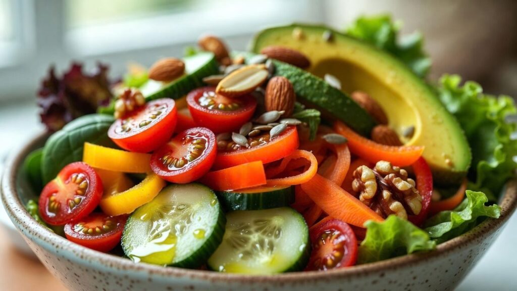 Vegan salads are rich in both soluble and insoluble fiber from ingredients like leafy greens, fresh vegetables, legumes, seeds, and whole grains, helping to regulate bowel movements, prevent constipation and bloating, stabilize blood sugar, lower cholesterol, and nourish beneficial gut bacteria for a stronger, healthier digestive system overall.