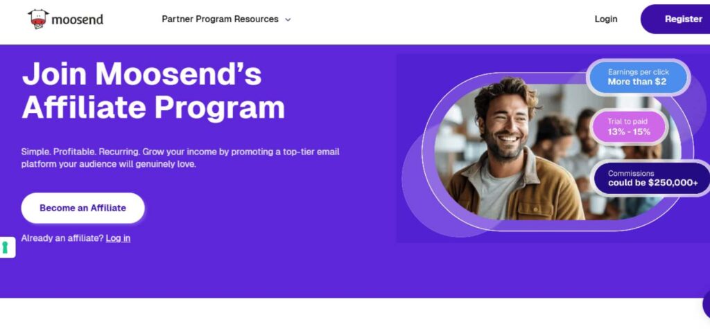 Moosend is beginner-friendly but still powerful. Their affiliate program pays 30–40% recurring commissions and provides analytics to track your performance.